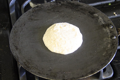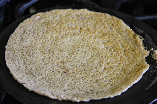 3.Smear a pan/griddle with oil and heat it at medium high.When hot enough to sizzle add 1/4 cup of batter and roll around in concentric circles to form a crepe.Let roast on one side ,fold in half,take off from the pan and serve.