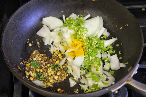 2.Now add the onion, turmeric,salt and green chili and saute for 2 minutes.