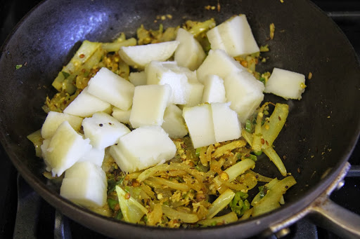 4.Add the boiled potato cubes and mix well,add 1 tablespoon of water and let cook for about 10 minutes.