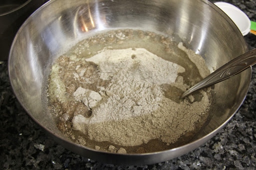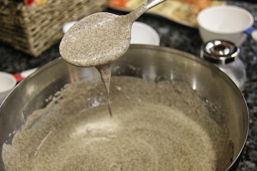 2.Add the ragi flour,salt and 1 cup of water(a little more if the batter is too thick) to get an idly batter consistency.