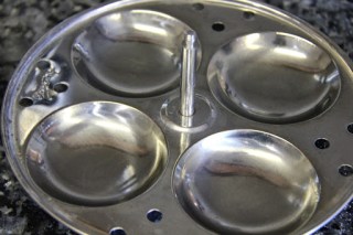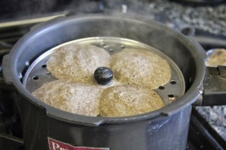 4.Grease the idli pans and put them in a pressure cooker with 4 cups of boiling water and cover and let cook without placing the pressure for about 15 minutes.Wait for 5 minutes before removing the idlis from the plates.