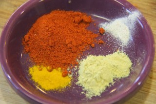 2.Take the turmeric, chili powder, fenugreek powder and asafetida in a small cup and keep it ready.