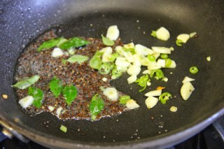 3.Heat the oil in a pan and add mustard seeds and let them crackle ,then add the curry leaves and garlic and green chili and saute for 1 minute.