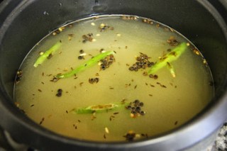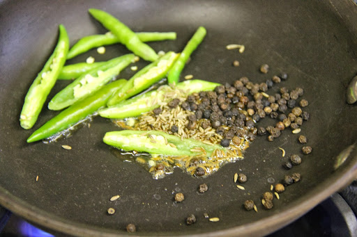 1.Heat 1 teaspoon of ghee and roast the cumin, black peppercorns and green chili for about 1 minute.