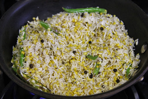 2.Now add the rice and moong dal and roast for a minute.