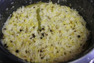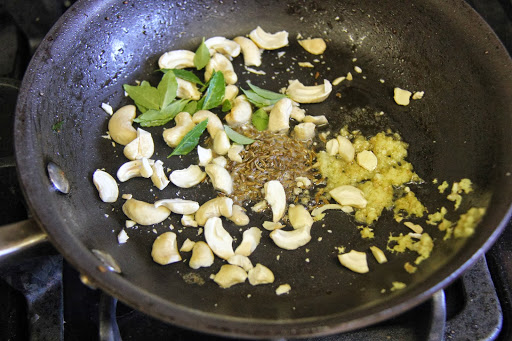 4.In a pan heat the remaining ghee, add the cumin seeds and cashews and roast for a minute,then add the ginger, asafetida and curry leaves and let splutter. Turn off the stove and mix it with the prepared rice.