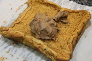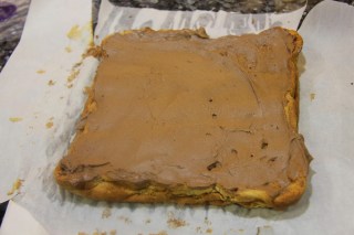 9.Spread out the cooled Piskota and lay the chocolate fudge icing on top and spread.