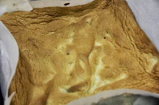 7.Transfer to cake pan ,spread evenly and bake for 18-20 minutes. It forms a light brown color on top.