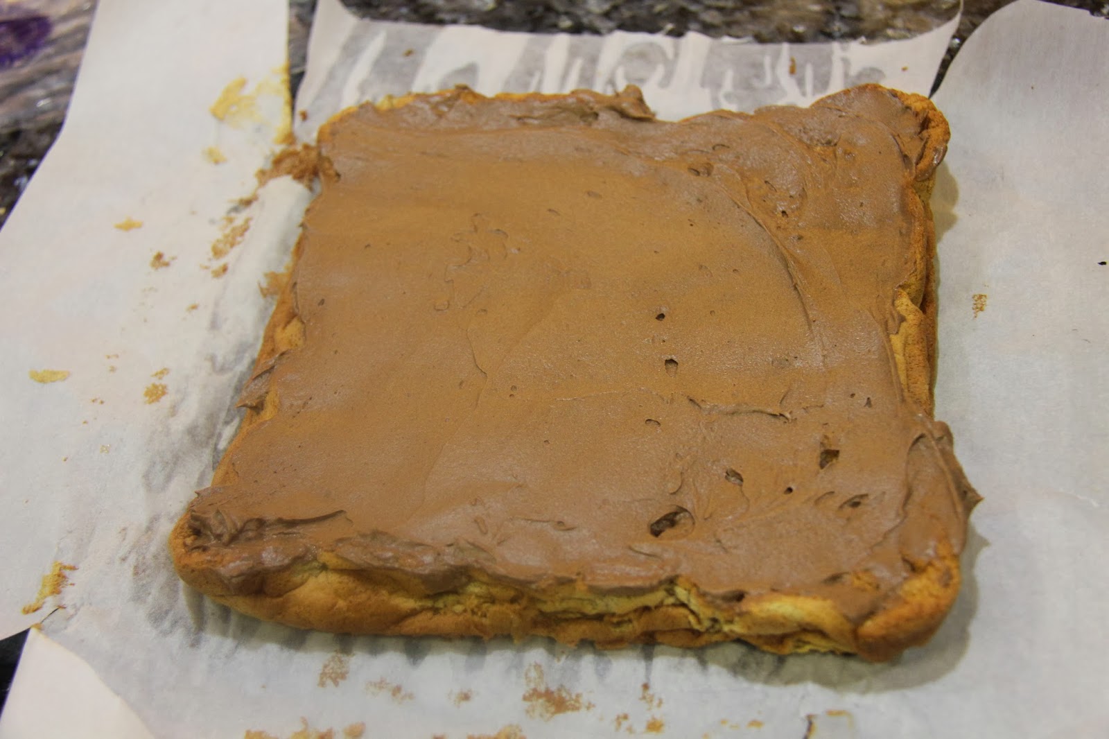 9.Spread out the cooled Piskota and lay the chocolate fudge icing on top and spread.