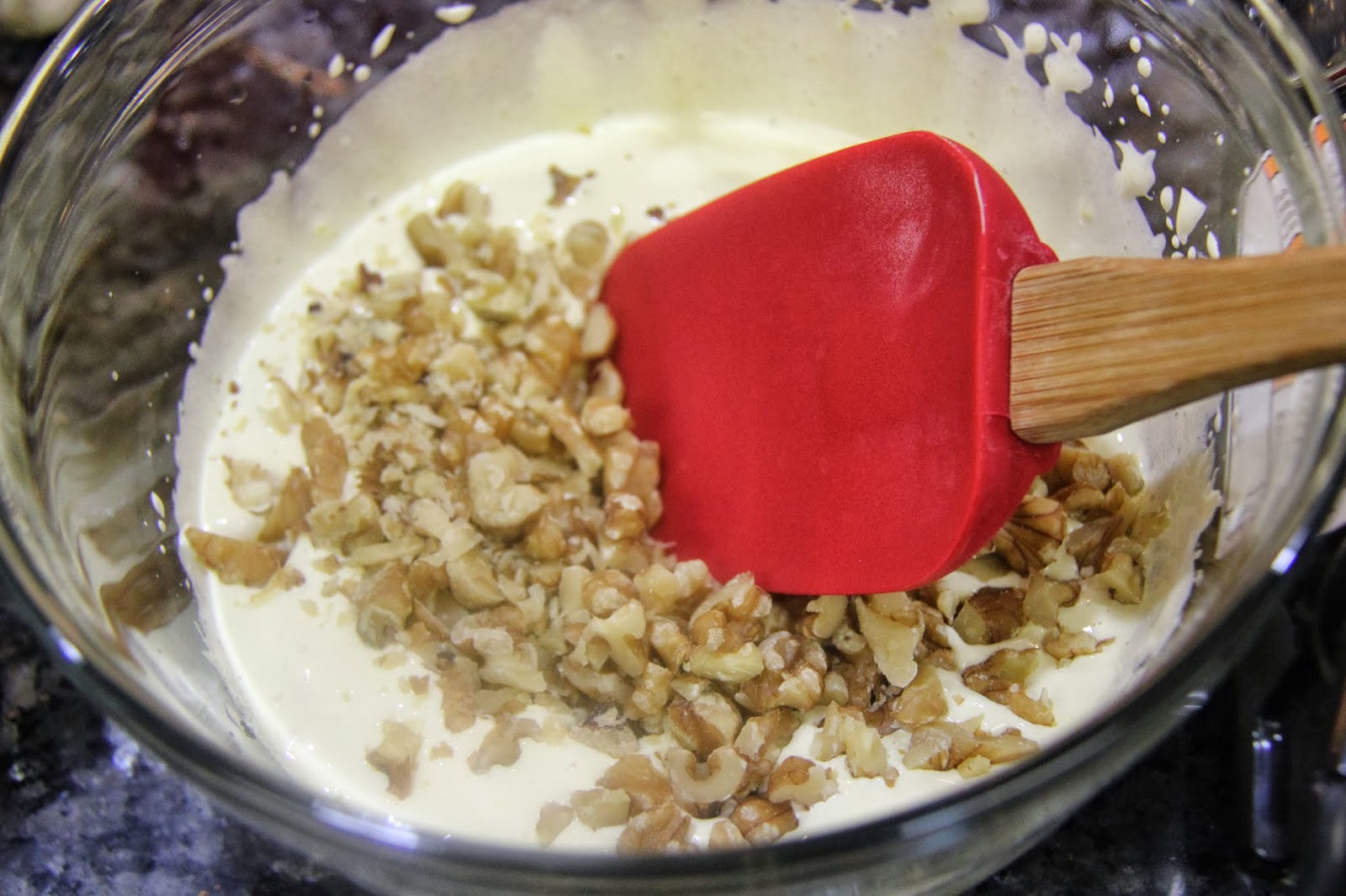 3.Fold in the walnuts to the egg yolk mixture.