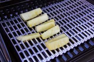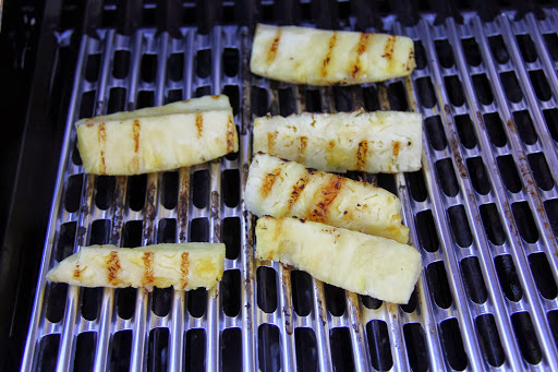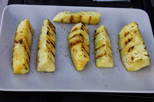 2.Place the pineapple on the grill or pan and sear until grill marks or a light char appears,turn it to get the char on all other sides.Remove from Grill and sprinkle a tad bit of salt and pepper and serve.