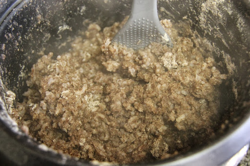 2. At this stage add the finger millet flour little by little and start mixing it in with the rice, keep stirring until all the raw flour gets mixed in and the smell and taste of the raw flour disappears.