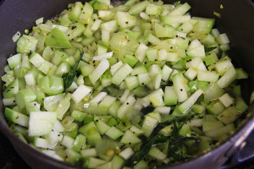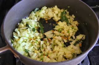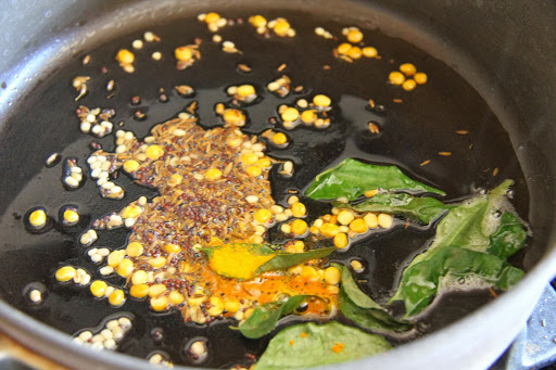1.Heat oil in the pan,add chana dal and urad dal and let brown lightly,add the turmeric, mustard,cumin and curry leaves and let splutter.