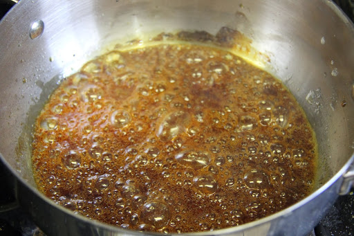 2.Start with heating the 8 tablespoons sugar and 2 tablespoons water in a pan on medium heat.The sugar will slowly turn color, keep stirring until it turns brown, immediately switch off the stove and add the 2 tablespoons hot water in ,1 tablespoon at a time.