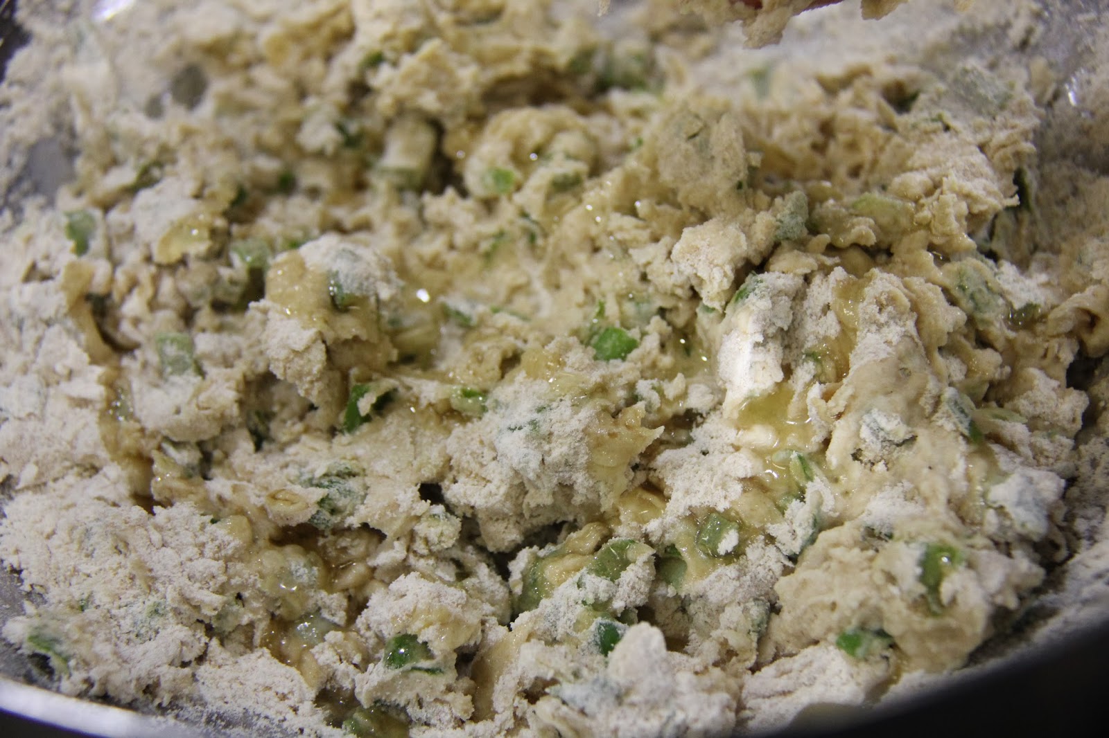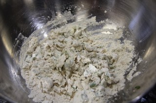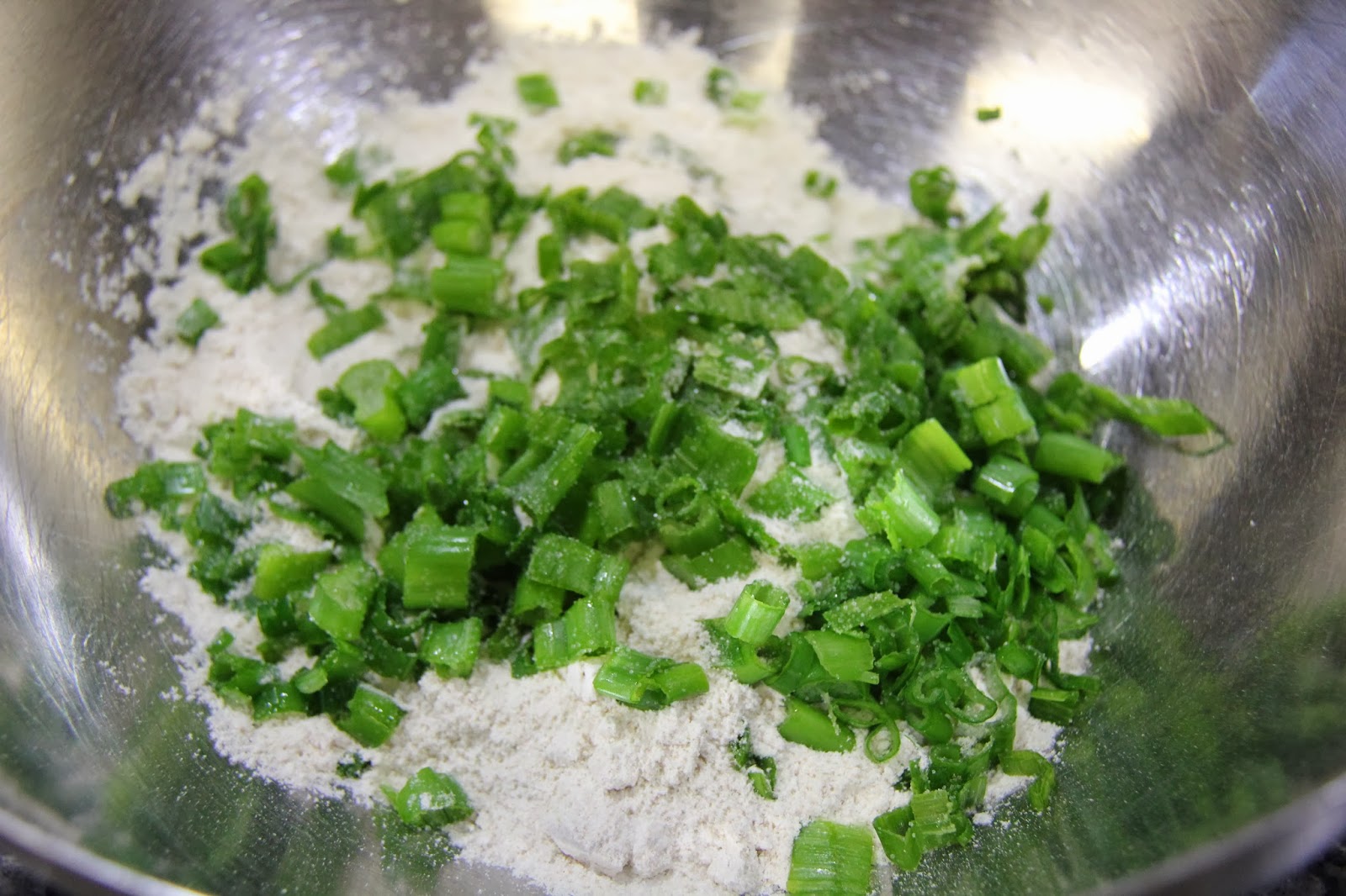 1.Take the flour in a bowl and add the minced green onion and salt in it and mix well.