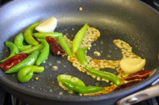 1.Heat half the oil in a pan, Add 1 teaspoon urad dal, fenugreek seeds, garlic, green chili and red chili and roast for 3-4 minutes.Keep aside.