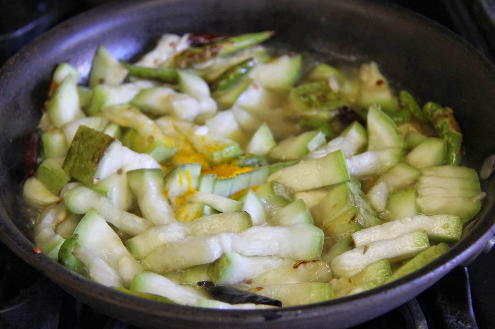 2.In the same oil add the bottle gourd and turmeric,sprinkle a little water and let the bottlegourd cook until it is soft.