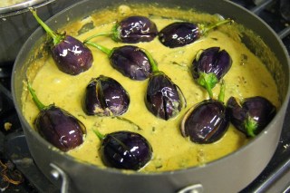 6.Add the eggplants to the gravy on the stove that has been simmering. Bathe the eggplants with the sauce a couple of times, cover with lid and let simmer for 10 more minutes for the flavors to get in the eggplant.