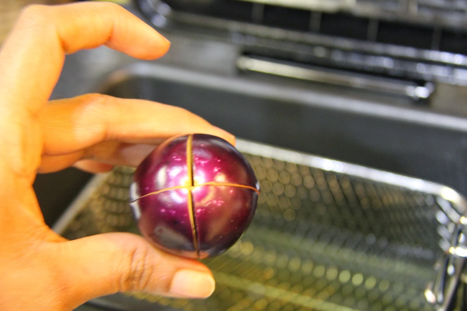 5.Heat oil for deep frying and make + shaped slits on them and fry them until the eggplants are salt,do not cook them completely, just enough so they are soft.
