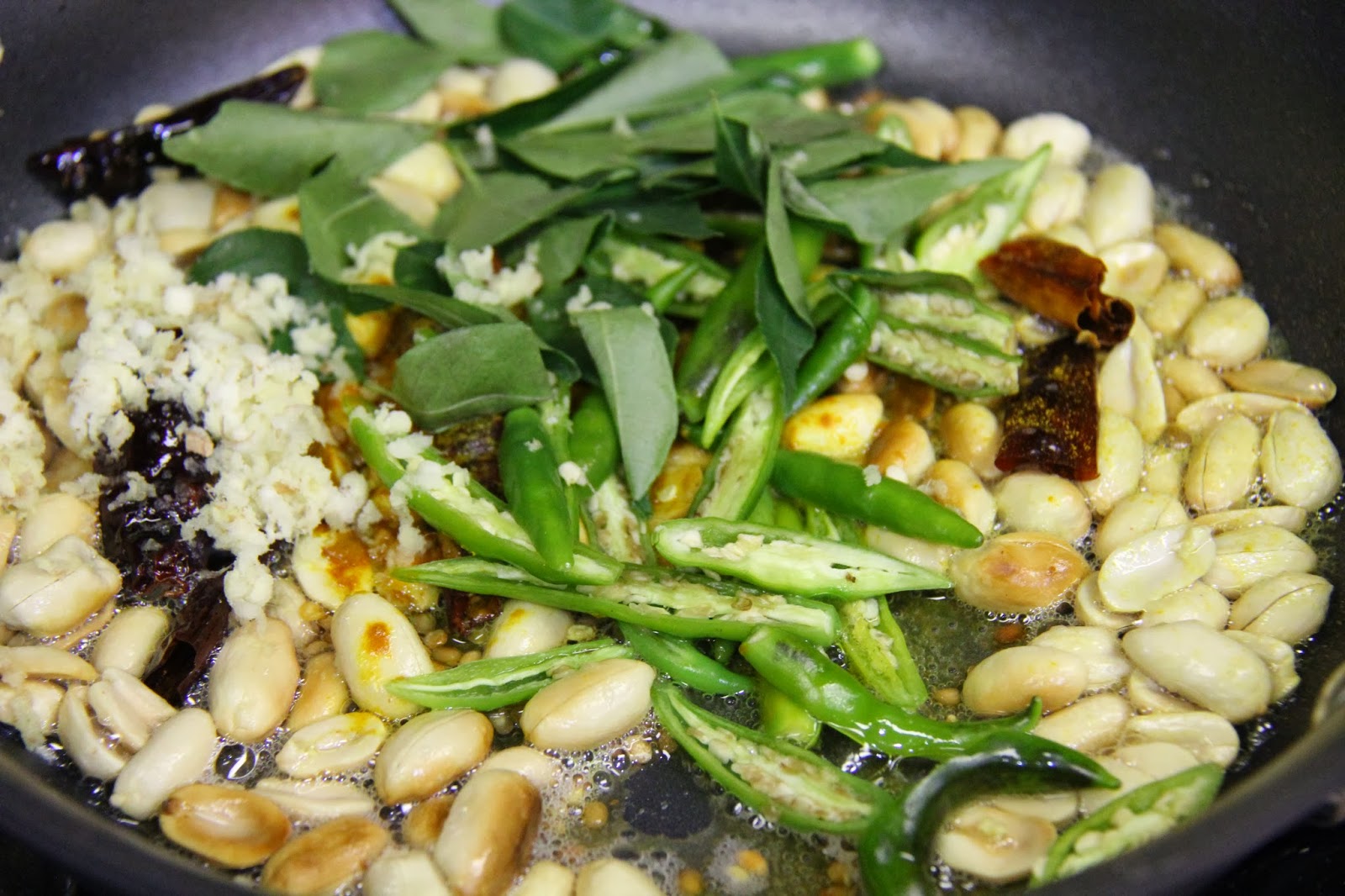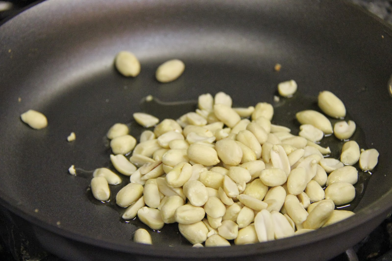 2.Heat the oil in a pan and add the peanuts and let brown lightly.