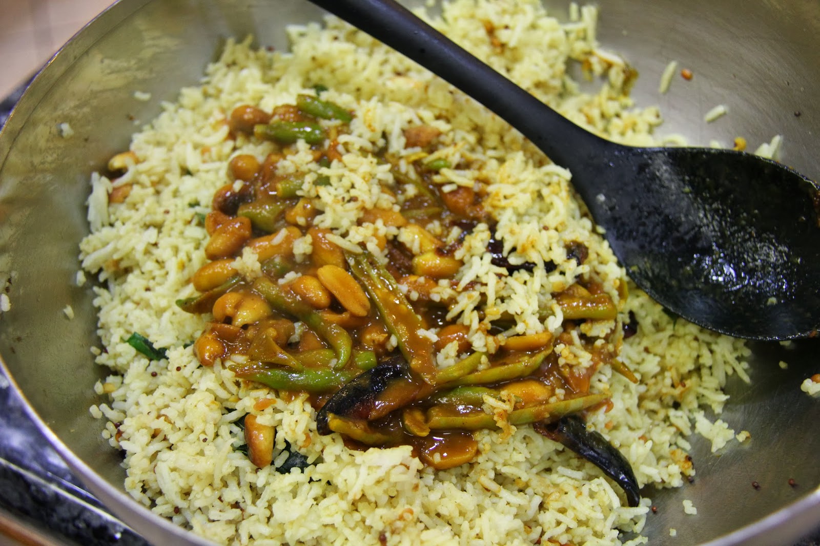 5.Add the cooked tamarind mixture to the rice and mix with a fork so all the mixture is combined with the rice. Adjust salt.