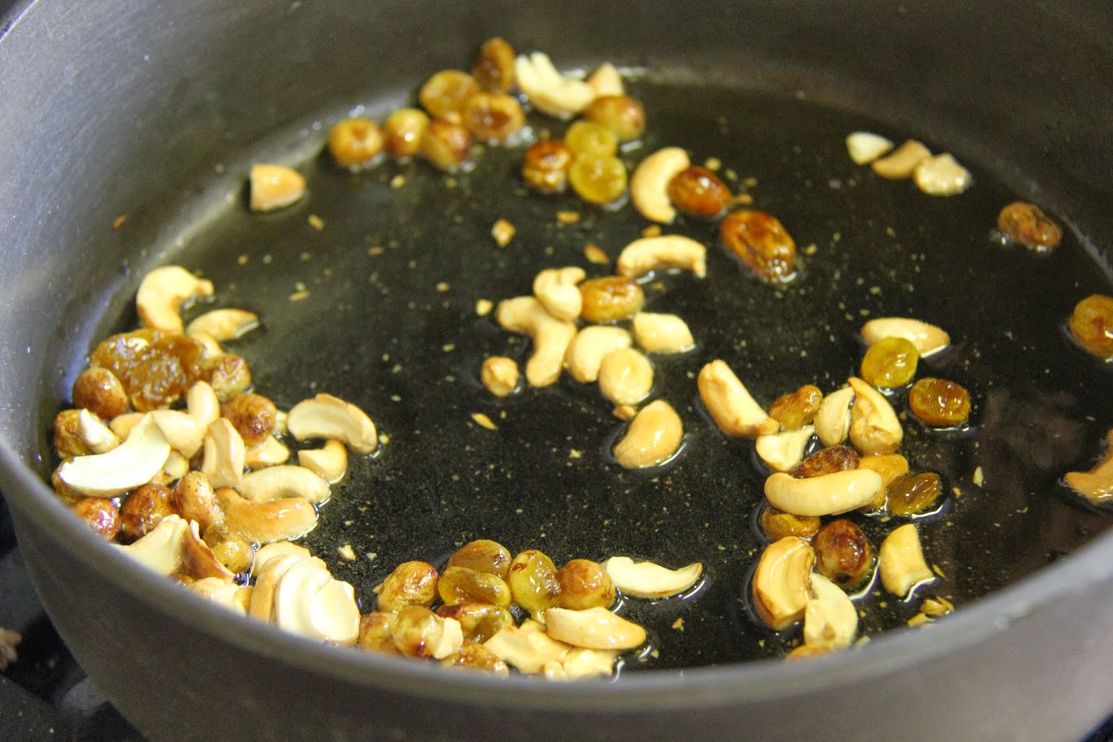 2.Heat ghee in a pan, roast the cashewnuts , raisins and coconut pieces till golden brown. Remove from pan, keep aside along with ghee.