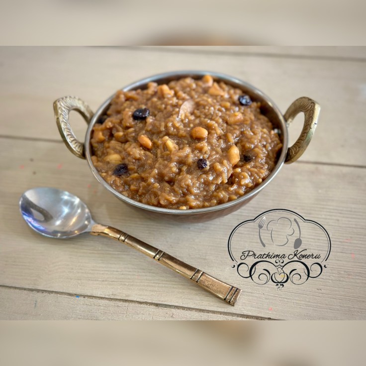 Normally made during Sankranthi,the harvest festival of Andhra Pradesh,this dish is a sweet rice preparation gently flavored with spices.Glistening with ghee,this dish can be served as an offering to God for all festivals.