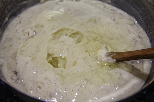 5.Add in the vanilla extract and half the oil and mix in the flour.