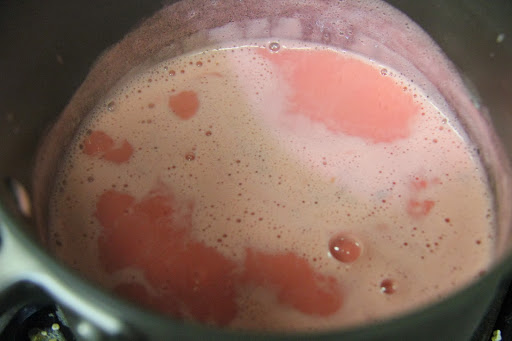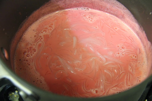 2.Bring the milk to a boil and add the sugar,rose syrup and mix until dissolved.Now turn off the stove.