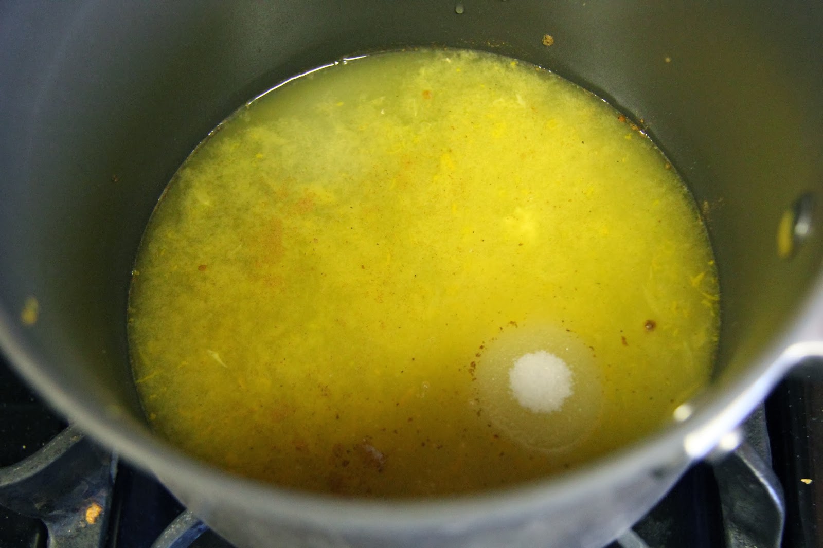 1.In a medium flame take the orange juice,spices and sugar in a saucepan and stir until sugar is completely dissolved.