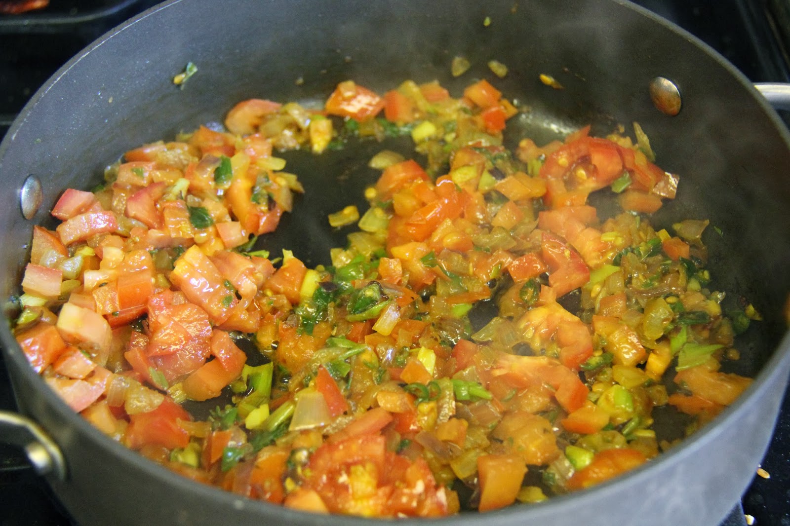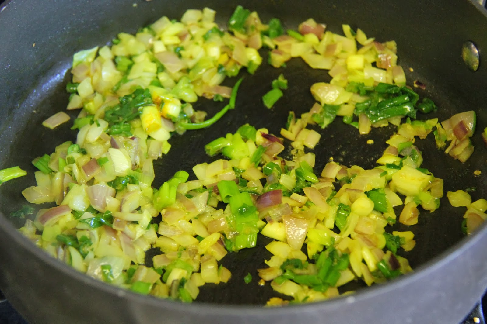 1.Heat the oil in a pan and saute the green onion,onion, turmeric powder,salt and green chili for 3-4 minutes until onions are soft.Add ginger garlic paste and saute for 2 more minutes.