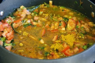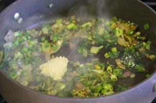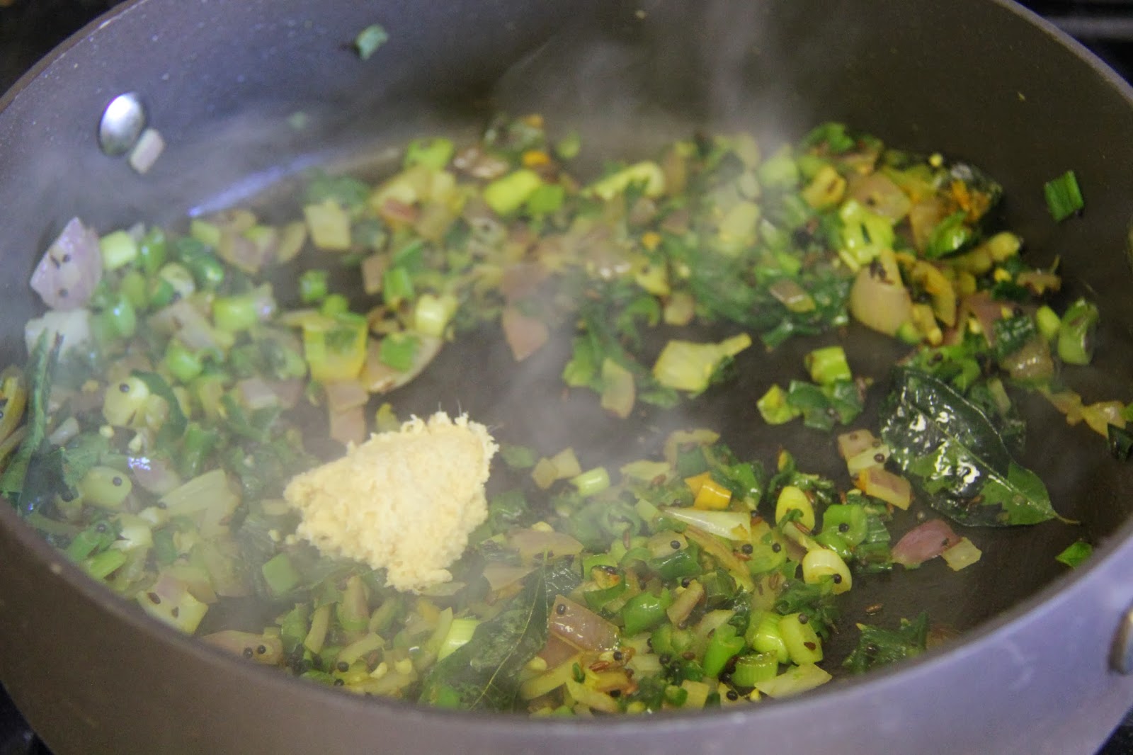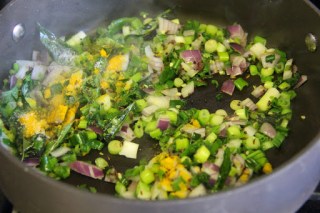 2.Add the green onion,onion, turmeric powder,salt and green chili for 3-4 minutes until onions are soft.
