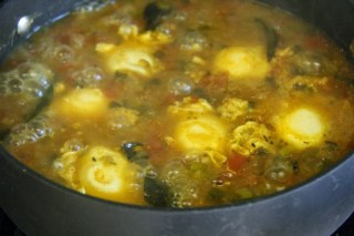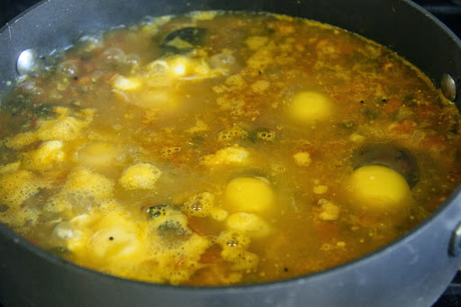 Poaching is a process by which food is simmered slowly in a liquid to achieve the cooked state.Food like eggs,meat etc can be poached to obtain a tender final product.Poached eggs are also served as a breakfast item and as a topping on meats as main course.This recipe poaches eggs in a onion tomato gravy seasoned with spices.