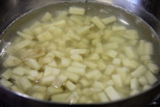 1.Heat water enough to soak the potatoes and bring the water to a rolling boil. Add enough salt to make the water a tad bit salty. Add the potatoes and boil for 5-7 minutes until they still hold shape but cooked.Drain the water.