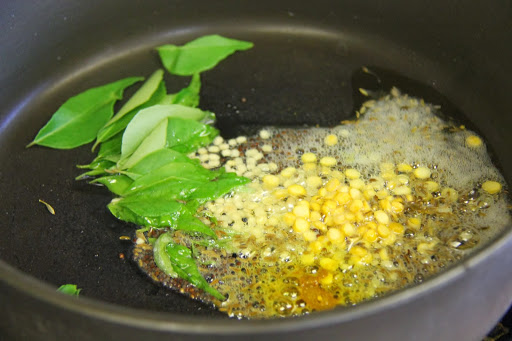 2.Heat oil in a pan and add chana dal and urad dal and roast till they are lightly brown. Add the mustard seeds and cumin seeds and curry leaves and let splutter.