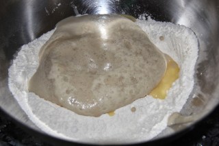 6.Now after the yeast has risen add the butter, the yeast.milk and the egg to the flour and mix well.