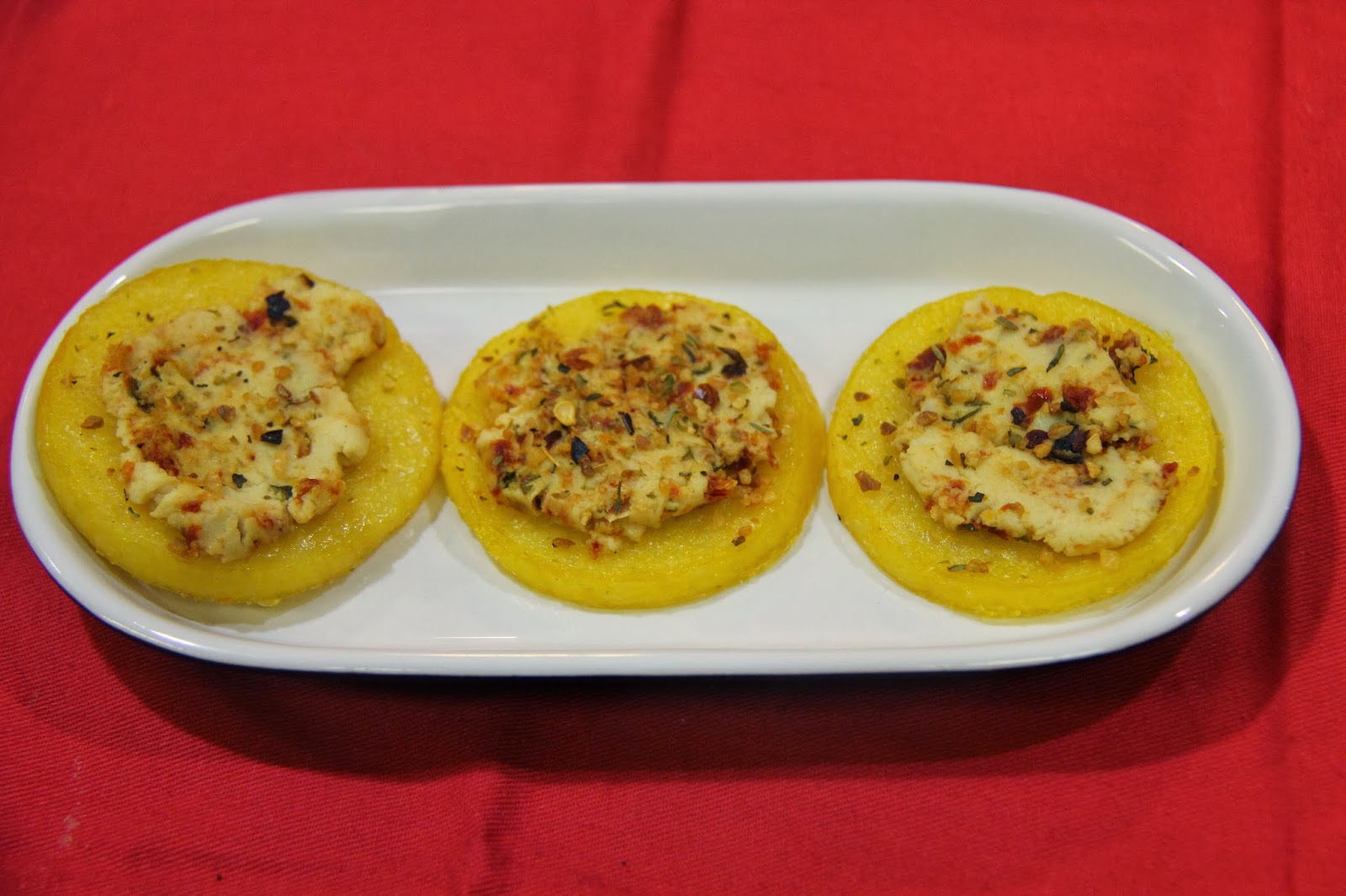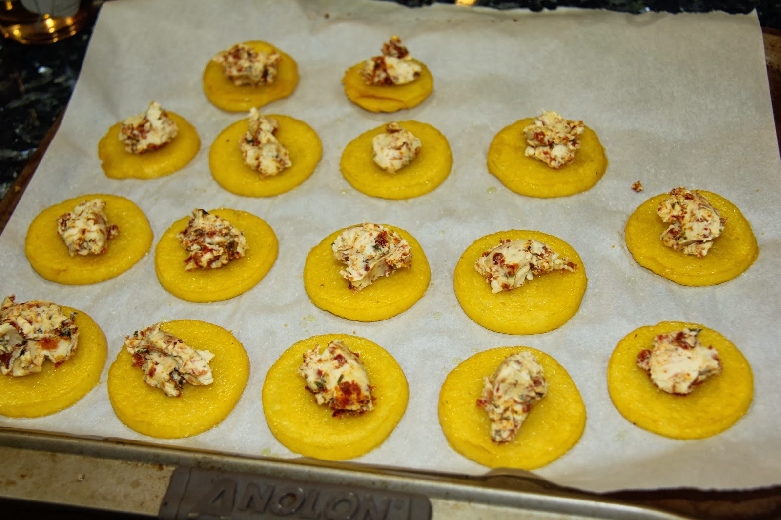 Polenta is of Italian origin.It is cornmeal cooked with water or cream.Served usually the starch in a main course.Polenta goes well with marinara sauce or other italian sauces.This recipe uses cooked polenta and bakes them to crisp them and topped with a sundried tomato goat cheese spread for an appetizer.