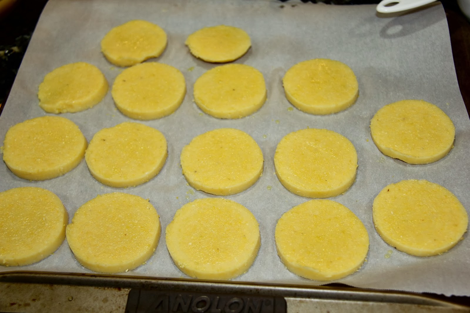 4.Slice the log into 1/3 inch slices and lay them on a baking sheet lined with parchment paper.Coat the polenta slices with olive oil
