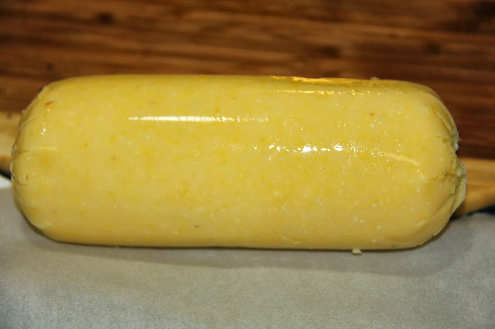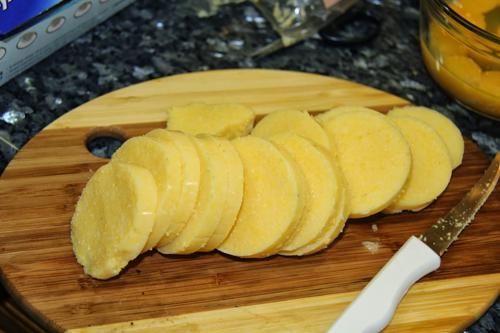 The polenta cooked should be firm to be able to set into a log.If too runny you will not be able to cut slices out of it.