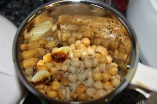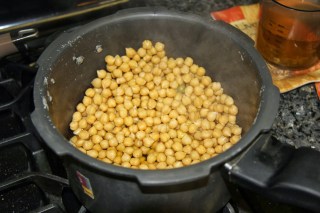 1.Take the chickpeas in a pressure cooker and add enough water to submerge the chickpeas, add 1/2 teaspoon salt and cook for 2 whistles and turn off the stove. Once the steam is gone drain the chickpeas. Keep the water.