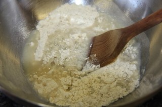 2.Bring water to a boil in a pan and add 1/2 cup of it to the flour and mix with a spoon. Add remaining water little by little and mixing until it forms a soft dough. Do not add too much water.