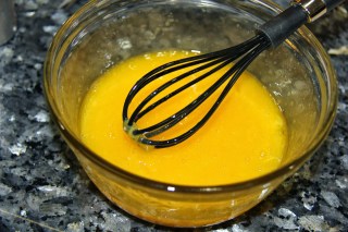3.Add the mixture to the baking tin. Place the pan in another pan with boiling water. Place them in the oven and bake for about 35 minutes,until toothpick inserted in center comes out clean.