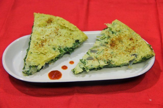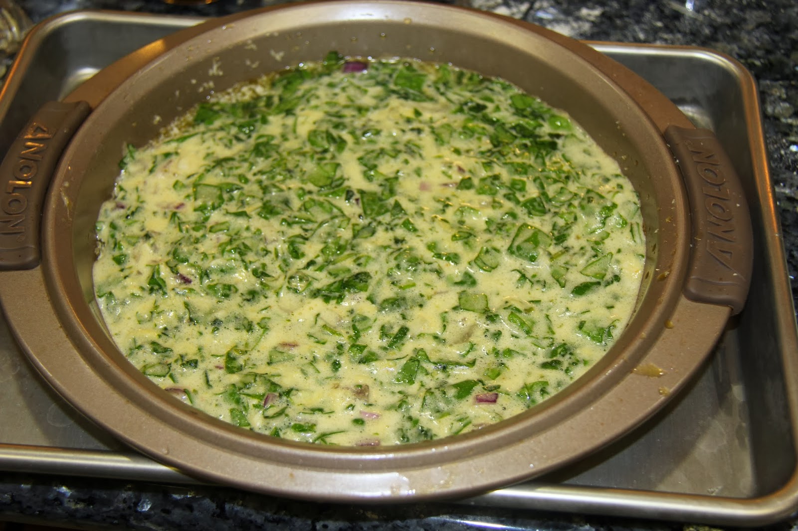 2.Whisk the eggs with salt.Add the spinach and cheese. If your mixture is runny add flour or more cheese.