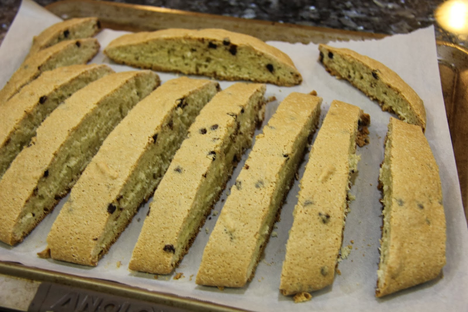 7.Remove from the oven and let cool for 10 minutes. Cut them in 1 inch strips and place them lightly apart on the pan and place in the oven again and bake for 10-15 minutes until they are crispy.Cool and serve with tea of coffee.