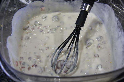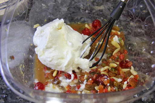 2. Take the lemon zest, juice, rum, vanilla,the dry fruits,raisins,half the cherries,slivered almonds and sour cream in a bowl and mix.