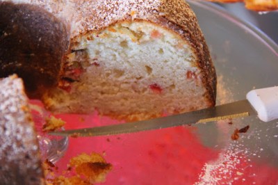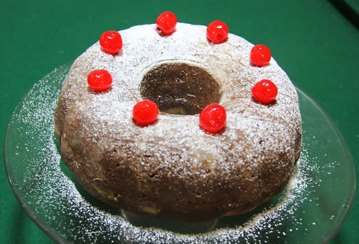 7. Transfer the mixture to the bundt pan and bake for 1 hour-1 hour 20 minutes or until wooden skewer inserted into the cake comes out clean. Let cool for 10 minutes and invert it onto a rack and cool completely. Sprinkle with powdered sugar and decorate with cherries.