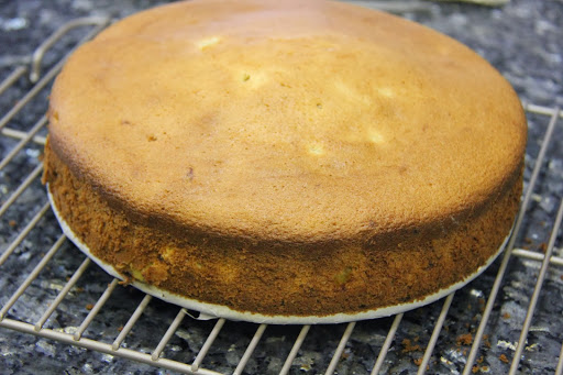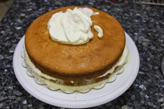 13.Once all the liquid had absorbed, Place the bottom half on your serving round or stand and add a dollop of whipped topping on the bottom layer and spread evenly.
