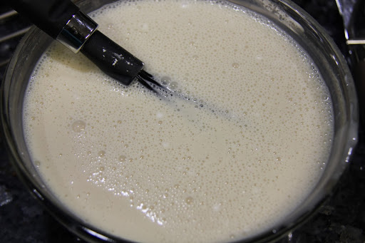 3.Take the egg yolks in a bowl and add the sugar and vanilla and beat until pale.Add the milk and mix until combined.