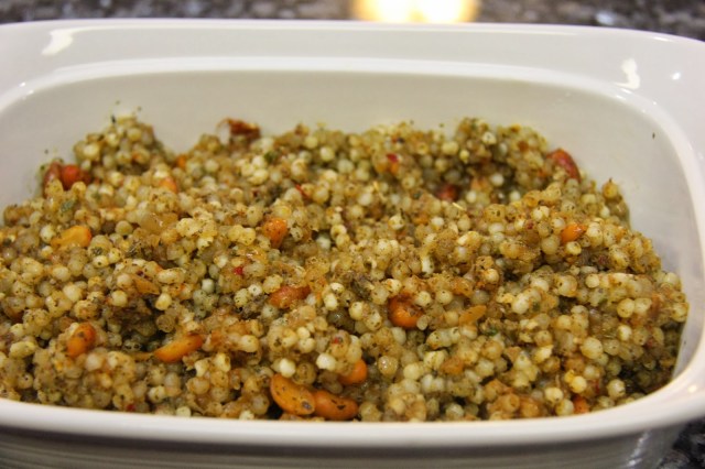 The Indian Tapioca is usually prepared with a light tempering of mustard seeds and curry leaves.Heres a slight variation with italian ingredients pesto and marinara sauce just as pasta is prepared.The tapioca has to be soaked overnight to cook it.This recipe works for a side or simple and quick carbohydrate for an entree