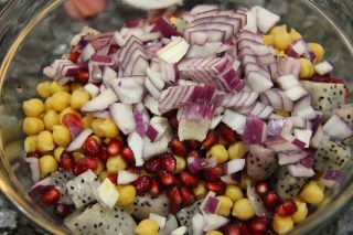2.In a bowl add the dragon fruit, pomegranate, onions, garbanzo beans and mix.